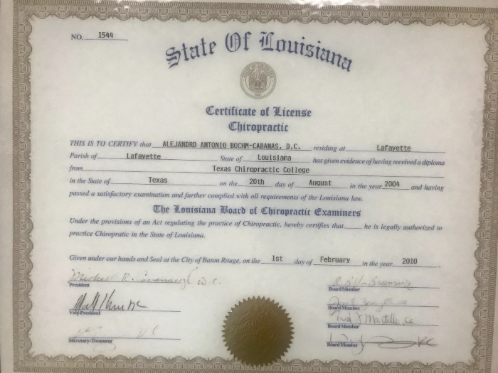 - Membresías Profesionales: Es miembro activo de la Asociación Americana de Quiropráctica, la Asociación Quiropráctica de Louisiana y la Asociación Mexicana de Quiropráctica Deportiva.