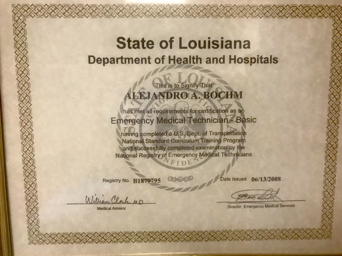 - Certificación EMT: Acreditado por el Registro Nacional de Técnicos en Urgencias Médicas (NREMT) desde 2008.